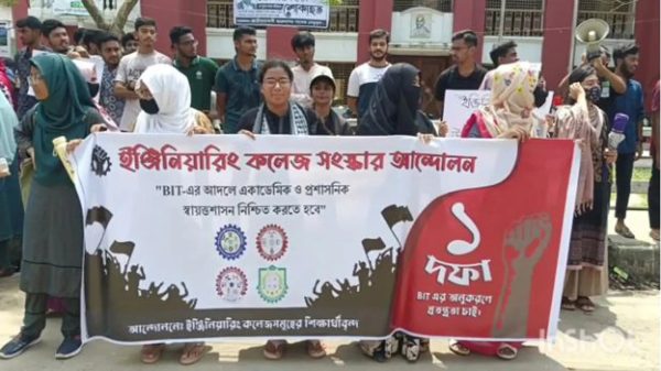 “ঢাকা বিশ্ববিদ্যালয়ের অধিভুক্তি কাঠামো বাতিল করে বাংলাদেশ ইনস্টিটিউট অফ টেকনোলজি মডেলের আদলে স্বতন্ত্রতা নিশ্চিতের এক দফা দাবিতে বিক্ষোভ সমাবেশ করেছে ইঞ্জিনিয়ারিং কলেজের শিক্ষার্থীরা। বুধবার (২৩ জুলাই) বেলা সাড়ে ১১টায় নগরীর