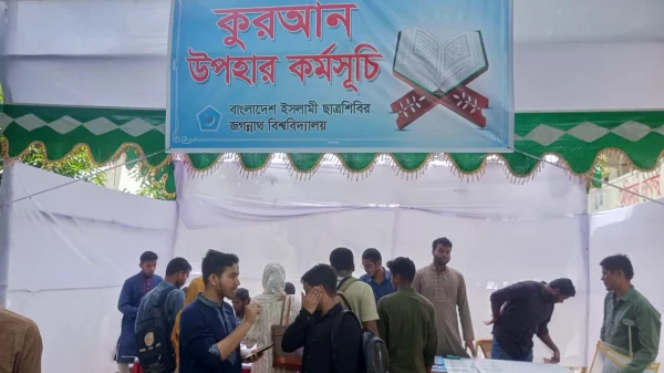 জগন্নাথ বিশ্ববিদ্যালয়ের (জবি) নবীন শিক্ষার্থীদের মধ্যে বিনামূল্যে কোরআন শরিফ বিতরণ করেছে শাখা ছাত্রশিবির। এসময় ৫০০ শিক্ষার্থীর হাতে কোরআন বিতরণ করা হয়। রোববার (২২ জুন) বিশ্ববিদ্যালয়ের কেন্দ্রীয় শহীদ মিনার প্রাঙ্গণে এ